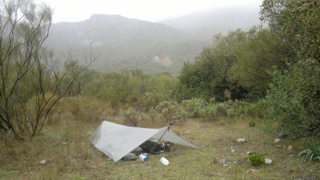 Slept well. Hips finally feeling back to normal. Drizzled all day. Found a nice campsite and so decided to cut the day short. Really nice that I have that ereader and thus something to do while lying under the tarp in the afternoon listening to the wind howling and the rain pattering down on the tarp, feeling warm and dry undern my quilt. Both pants and stretch-knit pullover soaked and I didn't feel like drying them with body heat during the night, so I'll be frigid when I put them on tomorrow. Some mild discomfort in exchange for the joy of being outside in nature during a storm. I definitely needed to camp, since too many days in hotels in succession is wearying, even nice and quiet hotels like those of the past four nights. Spotted another E-4/GR7 trail market on the trail itself, as opposed to signs at the edge of towns. Maybe I've left Málaga province and entered Granada. Rain slackened in the evening but wind picked up. Tarp well-positioned and ground is dense clay, so stakes should hold. Reading "Sailing Alone Around the World, 1895-1898" by Joshua Slocum. Would truly hate to be at sea with wind like I experienced high up today and yesterday. Then again, with no wind, a sailboat can't move. I'm not made for the sea, that's for sure. Wind picked up as the night progressed and I had to get out and lower the tarp to storm height, as shown in the photo below.