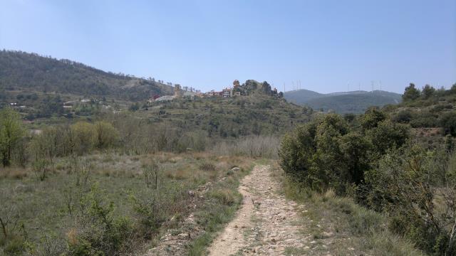 Cool in morning for a change. Lost the GR10 on the way down to Arcos de las Salinas (the GPX I was following is wrong) and descended about 200m along a newly built logging road before I realized my error. Rather than ascending 200m to where I lost the trail, I decided to bushwhack my way to what appeared to be the trail in the distance, and which was the trail, except I couldn't reach it by the route I was following. So then bushwhacked my way up the 200m to avoid backtracking. Finally got back to where I started and found the missed turn-off. Bushwhacking in rugged terrain like is not advisable. Absolutely exhausting, steep slopes, vicious thorns. Only by miracle did I avoid tearing my clothes. And fortunately no ticks, otherwise I'd have been covered with them from pushing through all that brush. Always better to backtrack on a good trail, no matter how long the distance, than bushwhacking through rugged terrain. Ate lunch at one of the bars in Arcos de las Salinas. Very busy due to this being Semana Santa. Camped on abandoned terraces along the PR-TE7, on the way to Torrijas.