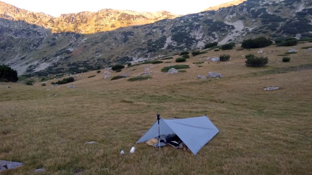 Bean soup and bread at Botev hut. Good wifi there, surprisingly. Decided to make a long day and continue to Tuzha hut, which also had wifi. There I had salad, two bowls pork soup and bread, which is pretty much all that was available, other than some vile-looking candy bars. Decided to camp outside hut. Not many flat spots and all such spots wind exposed, though no worse than last night's location.